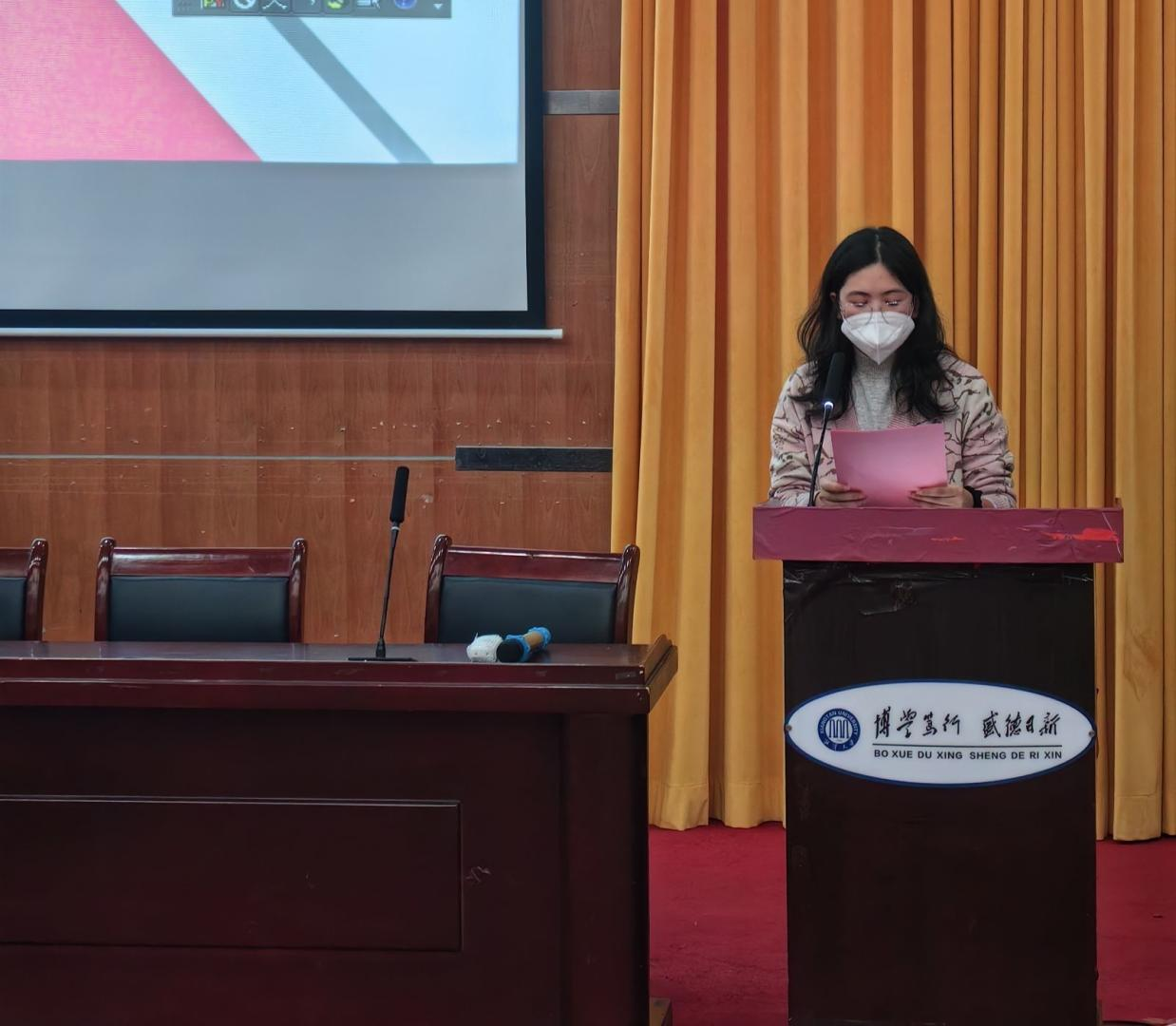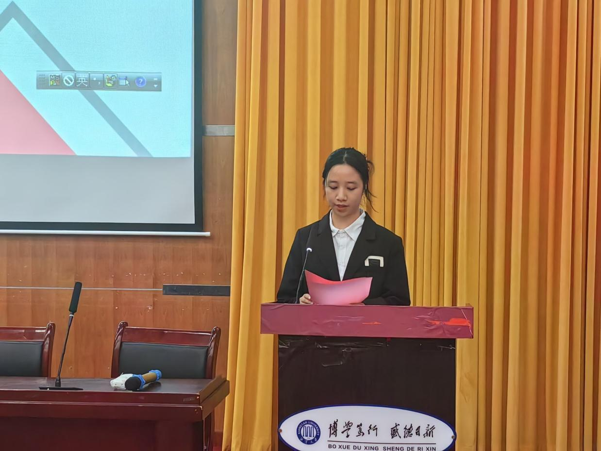 续蒋欣慧的致辞之后,金凤老师向新成员提出了两点期望: 在学风校风建设中发挥模范带头作用,推动良好学风校风的形成。团委、学生会成员应处理好两方面关系:工作与学习的关系。保证学习上进步,工作上出色。个人与集体的关系,自觉维护集体利益,分配任务时,要敢于迎难而上,多考虑集体的利益和解决困难的办法。随后举行了受聘仪式。