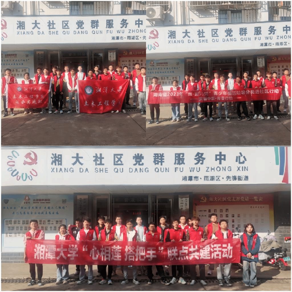 为深入推进全国文明城市创建工作,巩固创建成果,建立健全文明共创共建常态化机制,2023年11月17日下午2:40,土木工程学院16名志愿者与两名带队积极配合湘大社区开展了湘潭大学“心相莲 搭把手”联点共建活动第一期,顺利完成了三项共建任务。