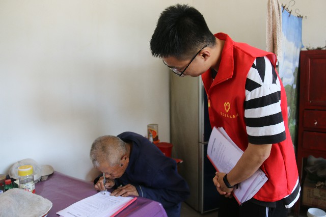 图为实践组员续晓健正帮助贫困户签帮扶告知书