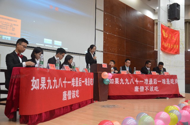 此次辩论赛决赛的辩题是“如果九九八十一难最后一难是吃肉,唐僧该不该吃”,正方为土木四班,反方为力学一班。双方选手在立论、驳立论、智辩等各个环节中思路清晰,引经据典,现场气氛迅速升温。在随后的自由辩环节中,就辩题展开更深层次的辩论,双方辩手个个妙语连珠,把比赛推向高潮。