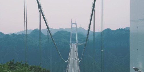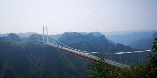 据工作人员介绍,矮寨特大悬索桥位于湖南省湘西州吉首市矮寨镇境内,距吉首市区约20公里,是国家重点规划的8条高速公路之一——长沙至重庆通道湖南段吉(首)茶(峒)高速公路中的重点工程。工程为双层公路、观光通道两用桥梁,四车道高速公路特大桥。桥型方案为钢桁加劲梁单跨悬索桥,全长1073.65m,悬索桥的主跨为1176m,创造了四项世界第一,极大地改善湘渝两省市的交通现状,对两省市乃至中西部的对接具有极其重要的意义。