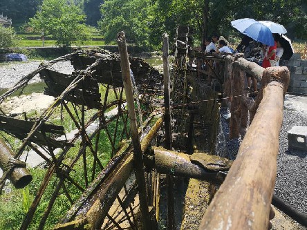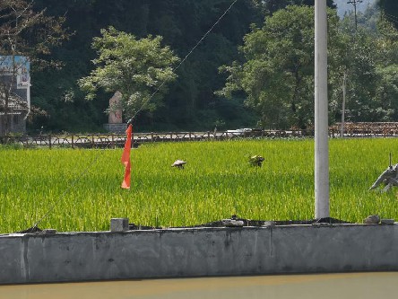 田地里除了外售的茶叶和桃树,还种植了村民自食的水稻。中黄村的水稻品种较为高大,其稻穗也比普通的更为饱满。调研团调查期间,水稻稻穗已经泛着点点黄意。村内设有水车引流灌溉,保证较为高处的水稻也能得到充足的水分。