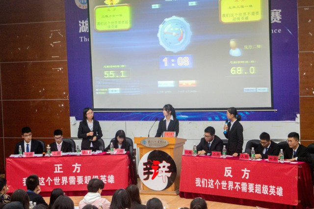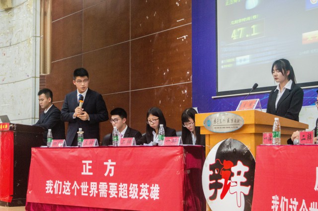 决赛进行阶段,正方围绕“我们这个世界需要超级英雄”立论。人类靠自身有很多事不能完成,所以有超级英雄的需求性,并且超级英雄善良正义的本质能给人们带来强大的精神寄托和鼓舞。因此,他们说为了世界更美好,需要超级英雄。反方则以超级英雄能力太强,没有事物可以约束其行动,个人认识所造成的错误带来的危害是毁灭性的来反驳对方。认为靠人类自身也可以使世界前进,不存在只有超级英雄才能完成的事。双方旁征博引,侃侃而论,现场高潮迭起。