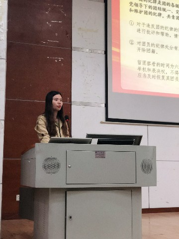 团委书记张芷瑜老师向团员介绍了共青团的发展史、入团流程,详细阐述了共青团的基本要求、共青团的组织制度及纪律,学习了习近平总书记对湘潭大学重要批示精神,强调了习近平总书记对巩固青年群众基础、引领新时代青年朝中国梦奋斗的展望。希望团员们牢记“四个意识”、“四个自信”,不忘初心、牢记使命,贯彻坚持共青团的基本要求,服从遵守共青团的纪律与要求,做一名合格的共青团员。
