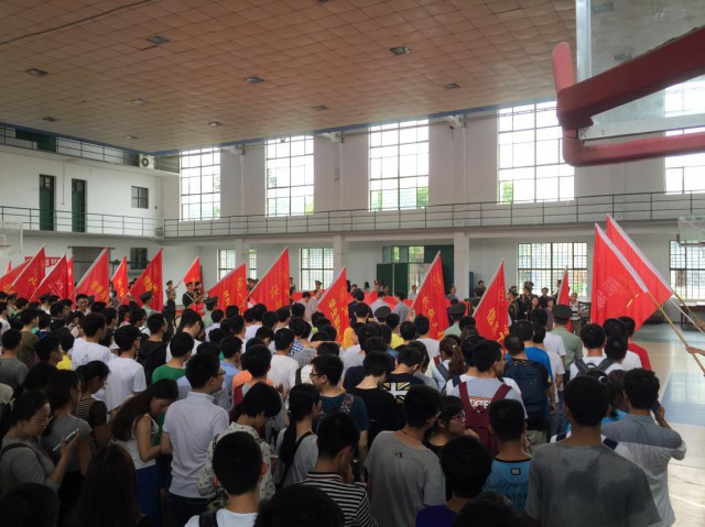 随着时间的流逝,活动也进行到最后一项——师生签名。“立正,齐步走!”一声嘹亮的口号划过体训馆的上空,护旗手们迈着整齐且坚定的步伐将一面70平米的巨大红色旗帜送至体训馆中央。大家虽然热情高涨但却仍然遵守纪律,按照顺序在鲜艳的旗帜上用力留下自己的姓名,每个人都幸福且坚定。