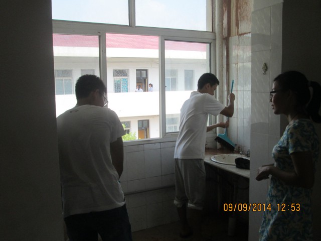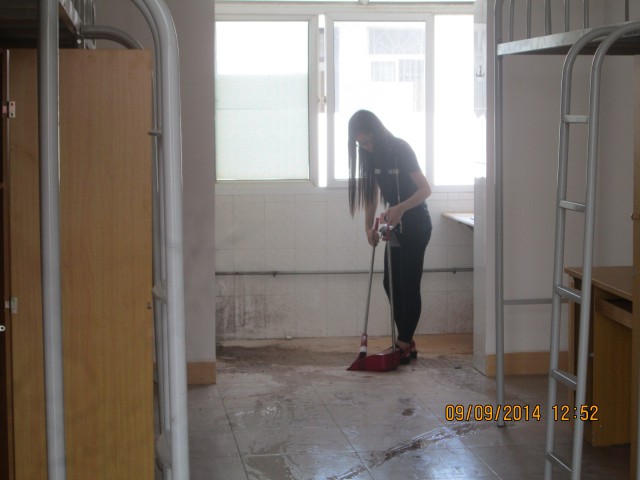 中午十二点半,伴着最为炙热的太阳,志愿者们在团委学生会生活部部长的带领下利用短暂的午休时间为新生们打扫寝室。扫帚、簸箕、拖把,同学们将各自寝室的工具带到现场,准备为即将到来的新生收拾出一个明亮整洁的新家。刚刚装修完的南苑寝室地面上满是装修时留下的残渣,同学们却是不怕苦不怕累不怕脏的将地面、桌面一一打扫干净。
