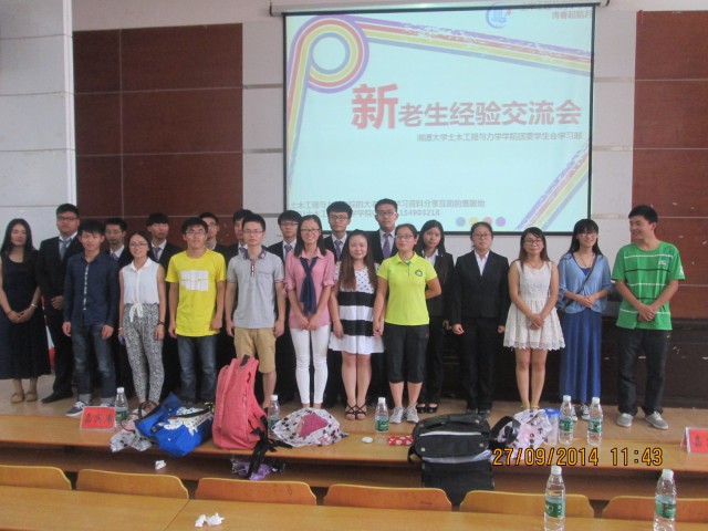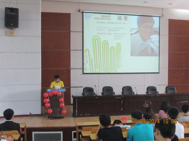 2014年9月27日早,在逸夫楼第二报告厅举行以"青春起航日"为主题的新老生交流会成功举行,本次邀请的优秀学生代表有吴冬、王丽晓、张乐、黄思怡、赵明胜子。