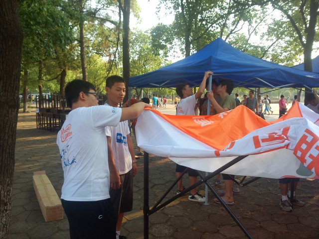 上午7时,在大家都还在睡梦中的时候,土力院全体成员已经在金瀚林5栋办公室集合完毕。在主席团的带领下,大家团结一致的将帐篷等储存在办公室的迎新物资运送到迎新点,并在大家的协同合作下,迎新帐篷很快搭建完毕。随着时间的推移,温度也渐渐升高,但抵挡不了大家工作的热情,搬桌椅,铺桌布,挂横幅,还用桌子隔开了一个专门摆放新生的行李的摆放区,大家挥洒汗水,为的是给即将到来的学弟学妹们一个完美的开始。院团委书记欧阳姗娜老师也亲自来帮忙铺桌布,并夸赞我们的迎新点设置的大气。当土力院的锦旗在风中飘扬的时候,也就标志着迎新点设立工作正式完成。在迎新点有为迎新工作人员、新生及其家长准备的矿泉水以便休息时饮用,迎新点对面的特色标语“把行李交给我们,你就到家了”也衬着今天骄阳似火的天气温暖着人的心房。