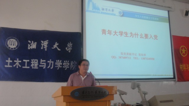 土木工程与力学学院宣传部(记者 岳梅 薛思东)2013年9月14日下午,湘潭大学党委党校第86期材料与光电物理学院、土木工程与力学学院入党积极分子培训班第二、三次授课在南山第八阶梯教室进行。