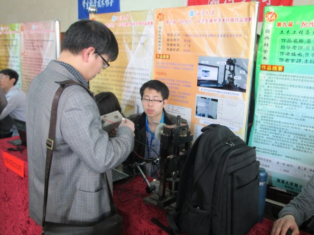 土木工程与力学学院宣传部(记者 卞佳维)3月9日上午8点,湘潭大学第九届“挑战杯”科技作品竞赛终审决赛在学活一楼大厅成功举行。此次竞赛邀请了十名专家评审对76支参赛队伍进行初试和现场答辩,数十名学校和各院领导也热切的与同学们交流,观摩作品,更是吸引了湘潭电视台的实时采访报道。