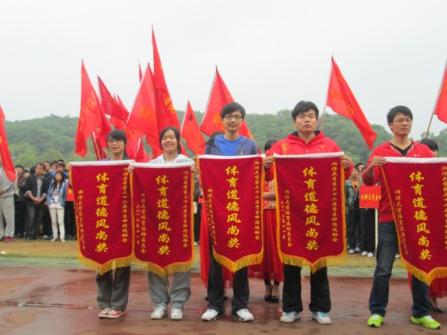 虽然运动会比赛项目已经结束,但是同们热情任未退却,在比赛结束时,高喊本口号,高扬各旗,再次点燃校运会火热氛围。随着各领导就坐完毕,主持人宣布闭幕式正式开始。首先,由校工会梁丽芝同志宣布教职工组织奖评奖结果,校团委肖志伟同志宣布生体育道德风尚奖,本届赛事主管陈建民同志男女子团体总分前8名,团体总分前8名等各项获奖名单。然后,校领导对各获奖系进宣布行颁奖仪式。随后,湘潭大副校长戴飞军同志致闭幕词,并提到:“在此次运动会中运动员们充分发挥了‘友谊第一,比赛第二’体育精神,希望广大师生在今后习与生活中再创佳绩。最后,湘潭大党委委员,副校长黄云清同志宣布运动会闭幕。