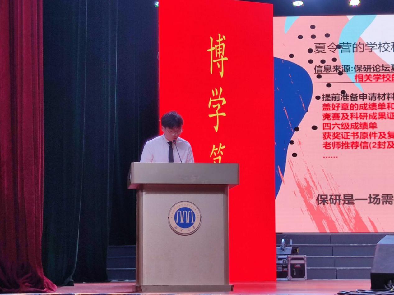 保研、考研和跨考的3位优秀学生代表向全体同学分享经验,保研代表屠梦成现已保研至东南大学,他分享了自己获得相关学校夏令营信息的平台,如论坛、贴吧等,鼓励同学们在学习中善于思考,注重个人的形象管理,以最好的状态应对面试。考研代表文磊成功考至本校研究生,他结合自身经历告诉同学们考研择校应结合自身情况精准选择,并鼓励同学们要树立对母校的自信心。跨考代表敖鑫梅跨考至西南政法大学法律专业,她讲述了自己选择学校和跨考专业的经历和复习经验,为大家分享了跨考的经验。