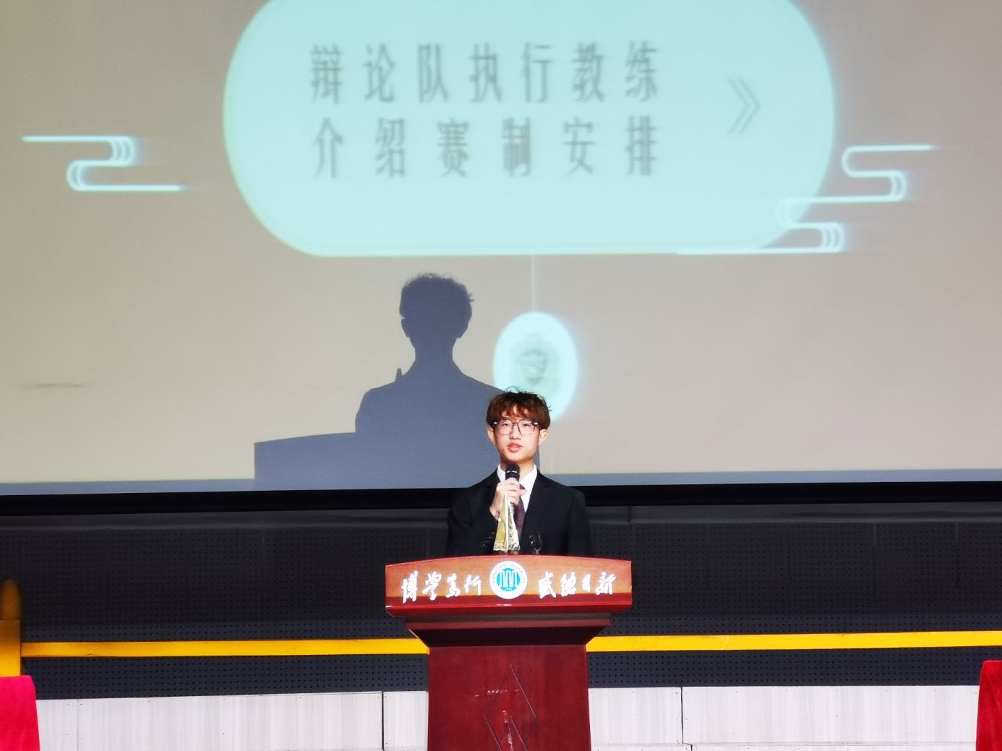双方辩手结束辩论后,辩论队执行教练李轩为新生介绍本次新生辩论赛赛制安排及比赛流程宣布本次“明德杯”新生辩论赛正式开幕,并播放宣传视频,向大家展示我院辩论队的日常风采。