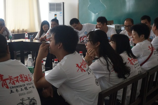上午,2003级土木工程1班的院友们坐在了土力院楼的教室里,开始了他们的班会,一起观看了属于他们大学四年的电子相册,班主任刘智林老师感慨万千,院友们深感虽时光飞逝,但大学四年生活犹如就在昨天,他们回忆了在大学的点点滴滴,表达了对老师们的感谢,也汇报了如今的生活工作状况。来自天南海北的他们聚在一起与老师们愉快的交谈着,场面温馨感人。