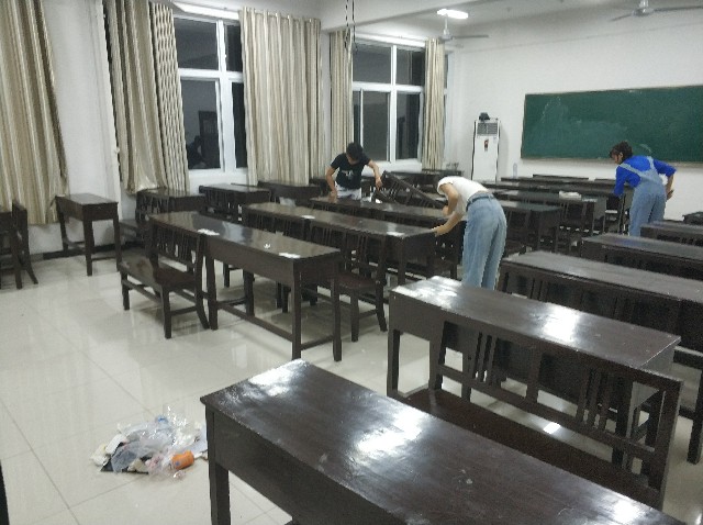 打扫过程中,各小组成员间团结协作、分工明确、配合默契,对院楼教室黑板、桌椅、地板等进行了清扫,经过一个多小时的辛苦劳动,所有教室焕然一新。