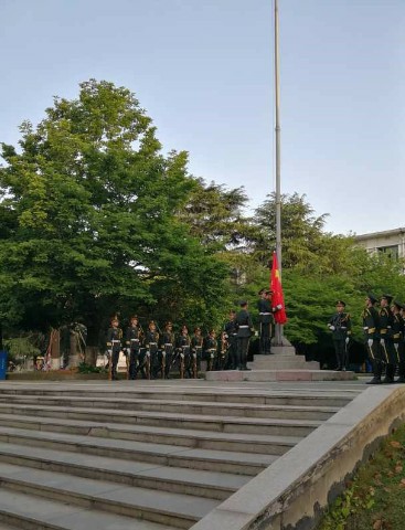 晨6点50分,一切准备就绪,升旗仪式正式开始。国旗护卫队迈着庄严而整齐的步伐走到旗台下。“升国旗,奏国歌,行注目礼”, 伴着庄严嘹亮的国歌,五星红旗冉冉升起,大家怀着崇敬与喜悦的心情,凝视着迎风飘扬的五星红旗,心中无比自豪。