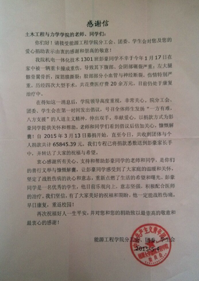 2015年1月17日,能源工程学院机电一体化技术1301班彭豪同学被重型卡车撞击,病情严重,且需花费20余万医药费,家庭承受着巨大的经济负担。获悉彭豪同学的需募捐的消息后,3月份我院学生会青年志志愿者服务部发起爱心书籍义卖活动,及时了解情况并通过学院党委副书记和土力院团委书记的审核批准捐助2000元,用实际行动来表达对彭豪同学的关怀,为他可以早日恢复健康出一份力。