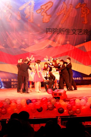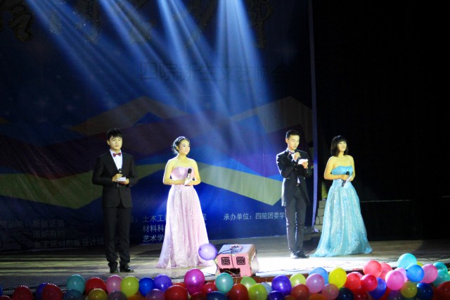“让我们一起摇摆,忘记伤痛来一起摇摆”,“我拿青春赌明天,你用真情换此生”几首充满了电音、摇滚元素的暖场曲瞬间将现场气氛点燃。《we toghter》富有节奏感的音乐响起,四院舞者涌上舞台,也将青春活力的气息带上舞台。在舞者的簇拥下四位主持人身着华服款款而来,晚会正式拉开帷幕。艺术院的古风朗诵《水调歌头》带领观众穿越千年,与古人把酒赏月,共话但愿人长久的婵娟之情。轮滑和魔术同样让人屏息凝视却有着迥然不同的风格,轮滑那飞跃七人的跳跃让台下的观众都不禁为他们捏一把汗,魔术的大变活人则真正成了见证奇迹的时刻。舞蹈串烧《just dancing》融合了四种不同风格的舞蹈却不让人觉得杂乱,动感的音乐让人热血沸腾,也让人想像节目名称那样just dancing。一众帅哥靓女在环保服装秀《secret》中身着多件环保材料做成的时装向观众完美诠释出炫酷,甜美,呆萌等多种风格,引起观众尖叫连连,用环保之风吹来不一样的时尚秀。土力院精心准备的舞台剧《jet'aime》用舞蹈说话,每个动作每个细节都在表达着爱意,使所有观众沉浸在温暖的爱的海洋之中。