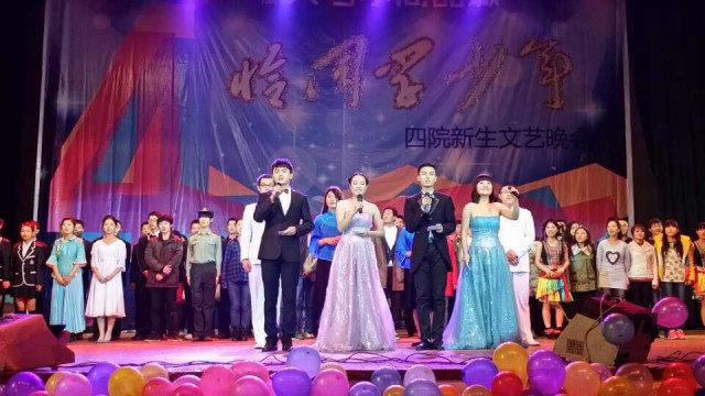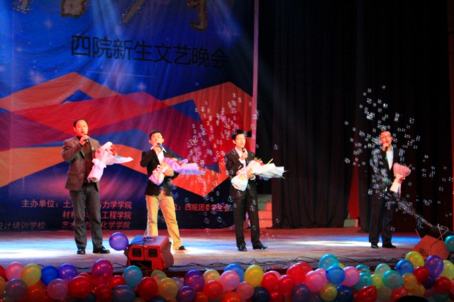 晚会渐进尾声,节目单上的神秘节目终于揭开了它飘渺的面纱,四个院的领导、老师们分别为晚会带来四首激情澎湃的歌曲,由土力院党委陈幸华副书记及新生班主任带来的《真心英雄》更是引得全场大合唱,同学们都情不自禁的拿起手中的荧光棒随着音乐缓缓摆动。别出心裁的神秘节目将整场晚会推上了最高潮。随后晚会在《恰同学少年》的铿锵有力的朗诵声中落下帷幕。