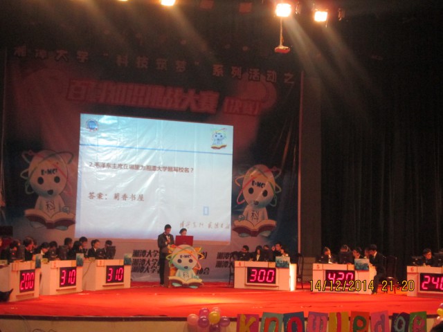 12月14日晚七点,由学生科技协会举办的“湘潭大学‘科技筑梦’系列之百科知识挑战大赛”百科决赛在俱乐部举行,本次比赛到场的嘉宾有湘潭大学团委书记齐绍平老师,教务处副处长胡义伟老师,科技处副处长李峰老师,老科技工作者协会会长柳树林老师及我院团委书记沈丽琴老师。经过两个多小时的激烈角逐我院最终捧得桂冠。