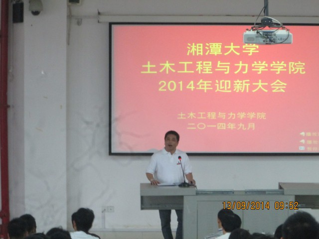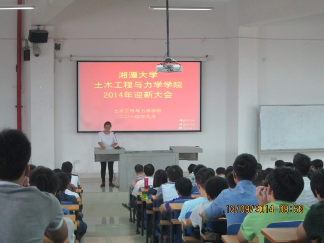 20114913日上午,湘潭大学土木工程与力学学院2014级迎新大会在兴湘B310成功举行。出席本次典礼的有土木工程与力学学院院长罗文波教授、院党委谢胜文书记、党委陈幸华副书记、副院长刘忠教授、副院长龙志林教授,还有我院各系主任,教师代表以及2014级各班班主任,学工办老师,参加本次典礼的还有2014级全体新生及各班辅导员。