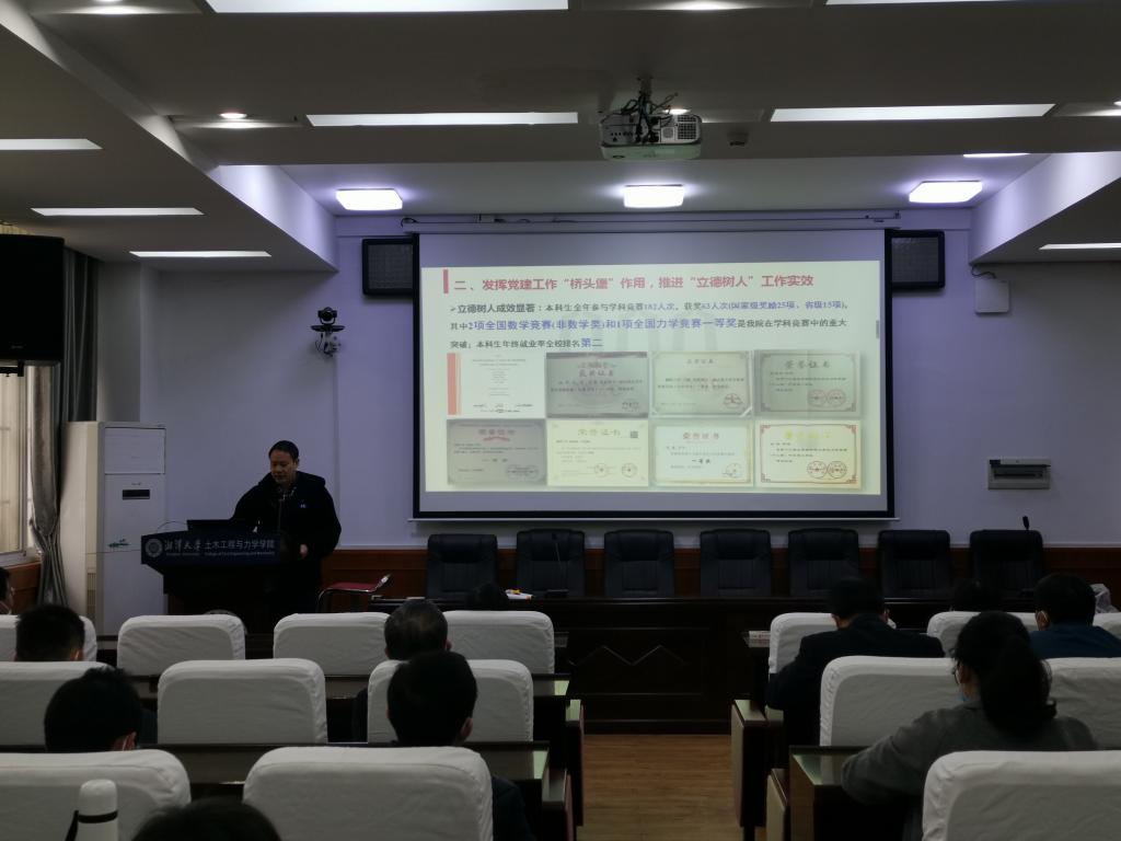 陈幸华代表学院党政领导班子做PPT述职报告。他从党建工作夯实引领方向思想根基、推进立德树人工作实效、激发干事创业强大动力、筑牢凝心聚力群众基础四个方面对学院2021年相关工作做了详细报告。他总结道,过去一年,学院领导班子围绕学校中心工作和本年度的目标责任,团结一心,勤政廉政,努力进取,取得了较好成绩。乘风破浪更进取,展望未来新华章。在新的一年,院领导班子将和全院师生一起,保持锐意进取,力争新的飞跃!