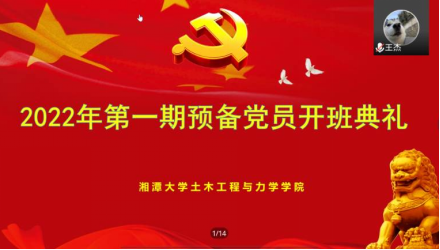 为加强学生党员教育管理,聚焦党性修养提升。4月19日下午,湘潭大学土木工程与力学学院2022年第一期预备党员开班典礼在线上举行,院党委书记、分党校校长陈幸华,专职组织员、培训班班主任张芷瑜及学院41名预备党员参加开班仪式。开班典礼由培训班班长王杰担任主持。
