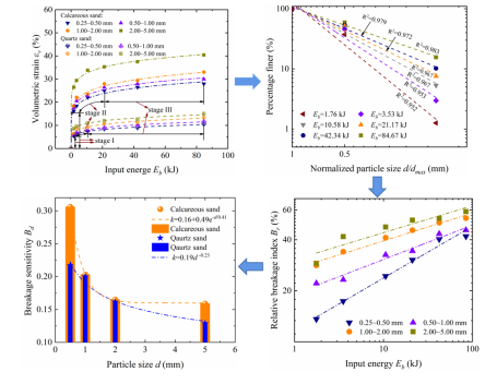 近日,我院龙志林教授课题组陈莎莎硕士在工程领域权威期刊《Construction and Building Materials》(Top期刊,Q1,影响因子6.141)上发表题为“Effects of particle size on the particle breakage of calcareous sands under impact loadings” (作者:陈莎莎, 张军辉, 龙志林*, 旷杜敏, 蔡洋)的学术论文。该论文通过一系列均匀钙质砂的冲击荷载试验,研究了冲击载荷作用下钙质砂的尺寸依赖性行为。基于不同尺寸钙质砂的孔隙比与输入能量的关系,提出了临界能量的概念来解释砂土的抗冲击性能。此外,还提出了用于评价砂土破碎敏感性的“破碎敏感性指数”Bd,其定义为每单位输入能量下相对破碎指数的增量。