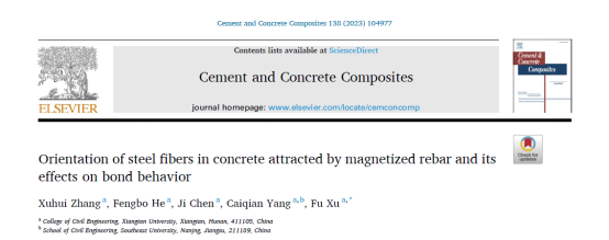 近日,我院科研成果以“混凝土中钢筋磁吸钢纤维定向分布特征及对粘结性能的影响(Orientation of steel fibers in concrete attracted by magnetized rebar and its effects on bond behavior)”为题,在线发表在土木工程材料领域国际顶级期刊《水泥和混凝土复合材料》(Cement and Concrete Composites,中科院1区TOP,IF: 9.93)上。第一作者为我院张旭辉副教授,许福教授为通讯作者,我院为第一完成单位及通讯作者单位。