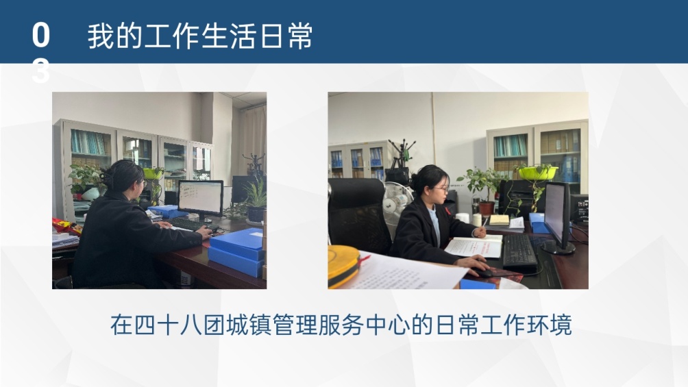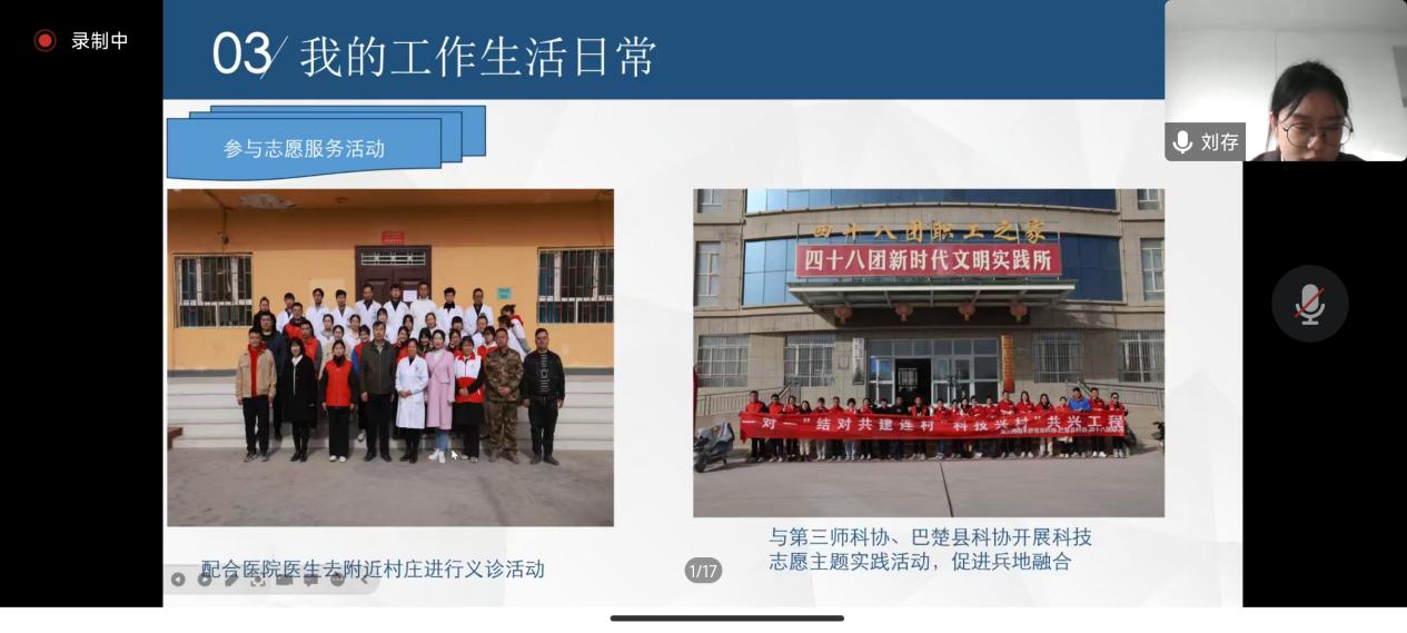 刘存分享自己参与西部计划的所见所闻、所思所想,她介绍了西部计划志愿者的权益和义务、西部计划新疆专项补贴标准、政策保障,并图文并茂地展示了在新疆四十八团城镇管理服务中心的日常,发出了“不到新疆,不知道什么叫做山河壮丽,幅员辽阔,新疆广袤的土地时刻张开双臂欢迎大家”的热情召唤。