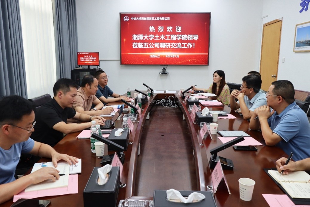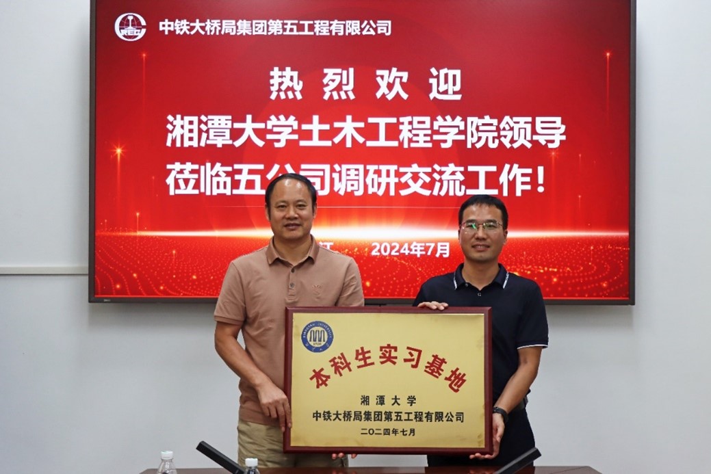 7月31日下午在中铁大桥局集团第五工程有限公司九江总部,公司党委书记、执行董事侍刚,总工程师叶绍其,副总经理曾海平,总经理助理王延坤,人力资源部副部长、设计分公司党支部书记罗婧等公司领导参加了交流活动。侍刚对我院的到访表示热烈欢迎,并简要介绍了公司改革发展情况及下一步校企合作展望。陈幸华对中铁大桥局五公司给予我院的关心与支持表达了诚挚的感谢,并介绍了湘潭大学的整体发展、办学思路及取得的成果,邀请公司下半年赴学校开展秋季校园招聘。交流中探讨了适应海外市场业务的人才培养、企业骨干技术人员继续教育和学历提升以及校企科研合作等内容,续签了本科生实习基地共建合作协议,并举行了实习基地授牌活动。