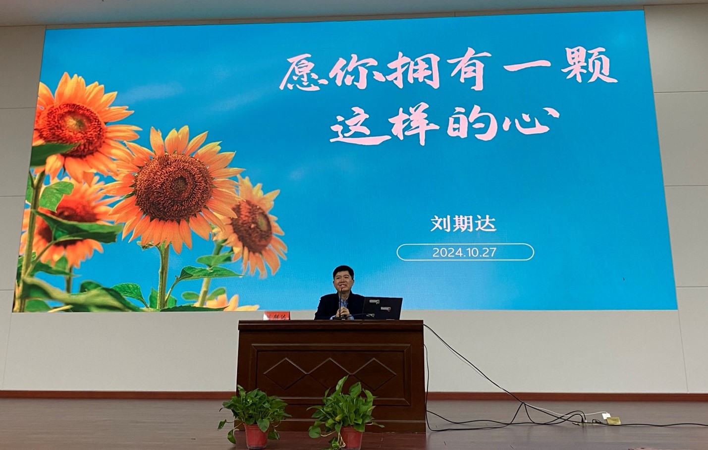 刘期达以“愿你拥有一颗这样的心”为主题,与同学们探讨和思考活着的价值和生命的意义。他分享了自己遭遇困境、走出困境、与爱同行的历程,嘱托同学们“不管处境多么艰难,都要追寻价值”、“不管遭遇多少困苦,都要心怀感恩”、“ 不管现实多么冰冷,都要热爱生活”、“ 不管岁月多么幽暗,都要抱有希望”,鼓励同学们追求做一个精神上精致、心胸上豁达、生活上浪漫的平和、坚韧、强大的自己。他用一个个画面、一个个故事,把坚毅勇敢、责任担当、热爱生活、追求价值的形象深深地刻画在了学生的心里,六百多人的报告厅不断爆发出热烈掌声和赞叹声!