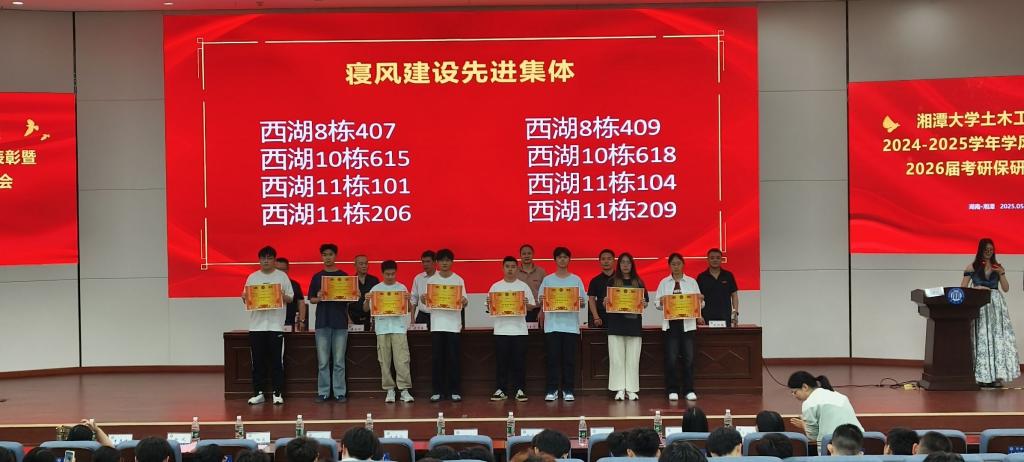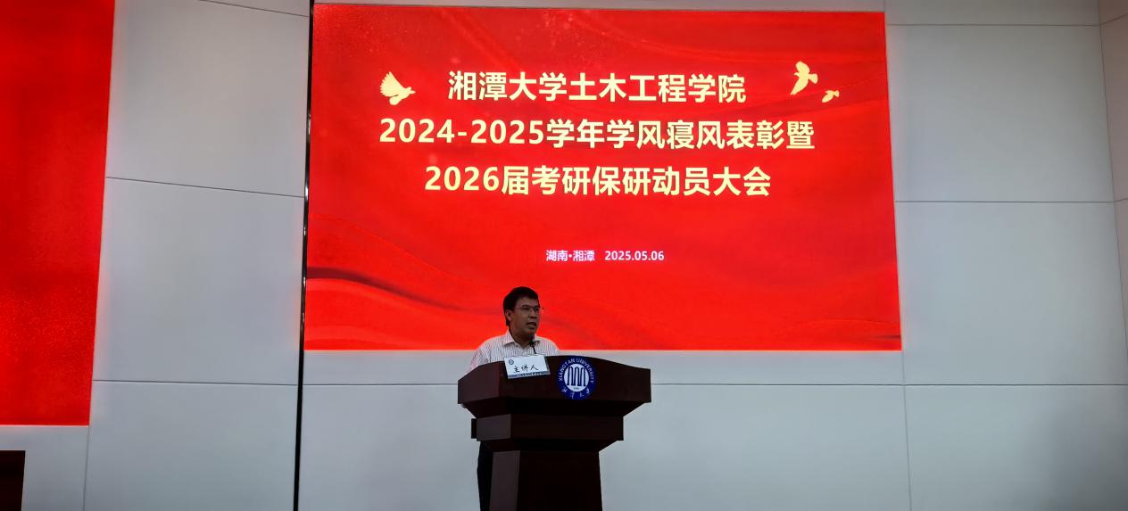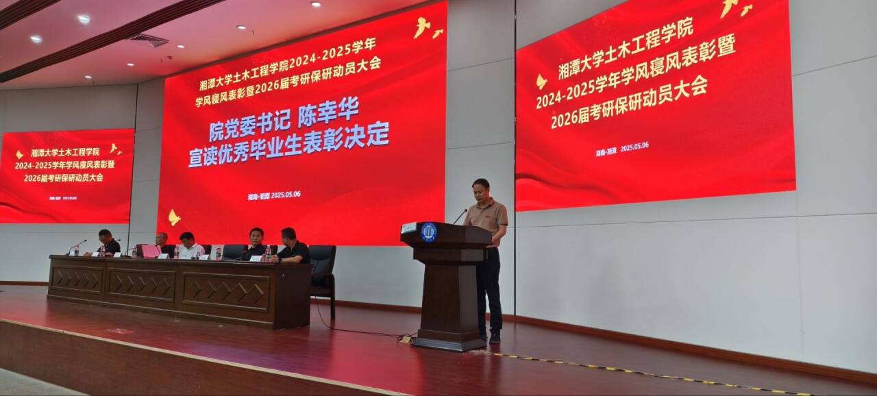5月6日下午,我院2024-2025学年学风寝风表彰暨2026届考研保研动员大会在研究生报告厅顺利开展。学院领导龙志林、陈幸华、陈宾、许福、欧阳巍及院关工委副主任傅菊辉教授出席大会并为获奖集体和个人颁奖。2022级-2024级学生参加。