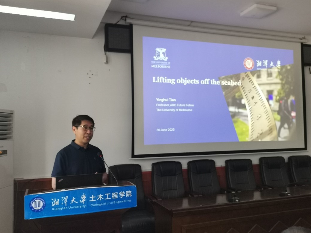 田英辉教授介绍了墨尔本大学和基础设施建设工程系的基本情况,并分享了近几年在裙式基础脱离海床提升过程方面的研究进展。报告从生活中将鞋子从泥泞地面拔起遇到的“深陷泥潭”现象出发,与从海床提升物体的过程进行了对比,引出了该现象蕴含的科学问题,给出了回收位于海床的油气设施用于退役、维修甚至迁移的应用场景,并重点介绍了团队利用大型离心机研究上拔速率对抗拔承载力的影响、桶形基础承受的持续上拔荷载特性以及开发用于促进上拔数值模拟的土-结构界面模型。田教授报告深入浅出引人入胜,让参加学术讲座的师生印象深刻、受益良多。田教授也表达了与湘潭大学土木学院加强交流合作的意愿,并邀请学院师生今后有机会多去墨尔本大学访问交流或攻读博士学位。
