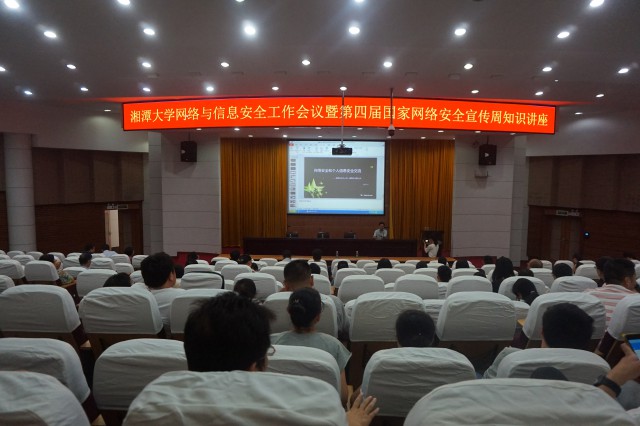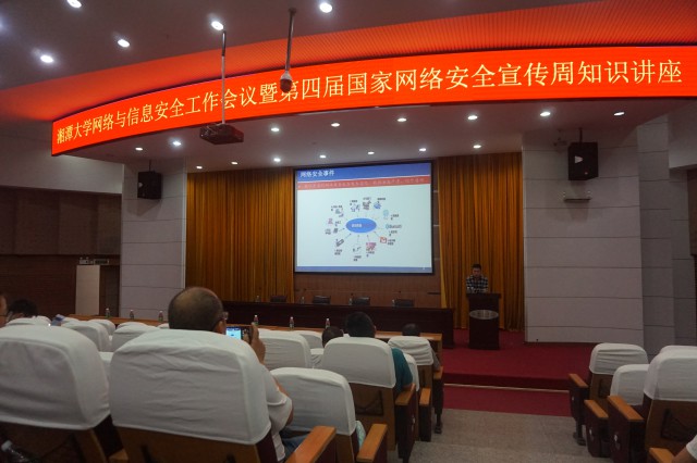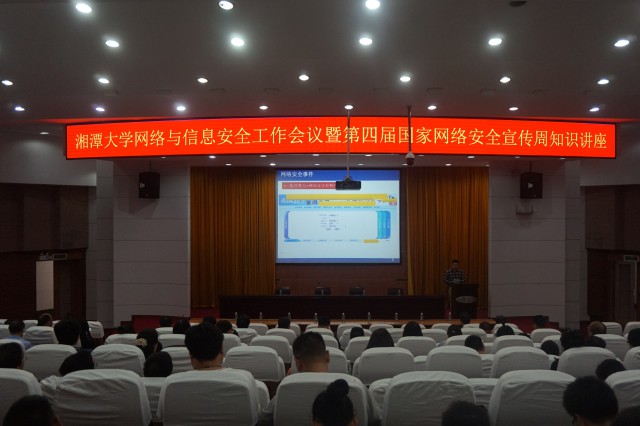 9月22日,湘潭大学网络与信息安全工作会议暨第四届国家网络安全宣传周知识讲座在逸夫楼一报隆重举办,由专家讲解网络与信息安全的基本知识和有关部署。湘大各网站负责人、各单位网络与信息安全的负责人以及学生们聆听此次讲座。