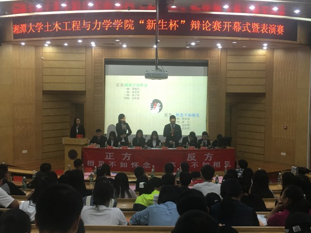 10月29日下午,在图书馆报告厅举行了土力院“新生杯”辩论赛开幕式暨表演赛。表演赛围绕怀念与相见到底哪个更重要展开。参加本次大会有学工办张芷瑜老师、第十一届团委学生会主席兼辩论队领队现湘潭大学执行教练吕佳学、湘潭大学辩论队队长阔忠斌、副队长朱敏、十四届团委学生会主席团全体成员以及各班辩导和17级全体新生。
