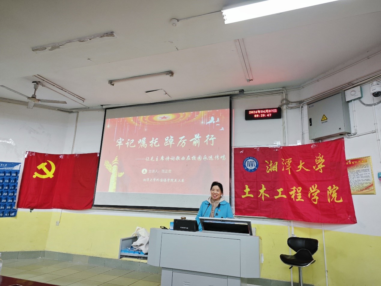 党课以“牢记嘱托、踔厉前行——让毛主席诗词歌曲在校园永远传唱”为主题。范老师选取了毛主席《七律·长征》、《沁园春·雪》两首经典的诗词歌曲,同时,范老师还现场教学员们吟唱《沁园春·雪》这首歌曲。整个课堂生动活泼,学员们掌声不断。范老师将毛主席嘱托“一定要把湘潭大学办好”与学校六十周年校庆热烈画面结合起来,以一首校友创作的校庆主题曲《湘大因你而美好》的欣赏吟唱,把整个党课带入高潮,激励学员们牢记伟人嘱托,谨记习总书记谆谆教诲,不忘初心、牢记使命、扎根伟人故里,弘扬优良传统,坚持立德树人,勇于改革创新,努力把学校办得更好、更有特色,让自己成为学校引以为骄傲的优秀校友。