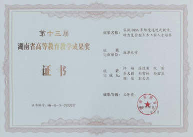 教学方面,为本科生/研究生系统讲授了《混凝土结构设计原理》、《混凝土结构设计》、《工程经济与项目管理》与《高等混凝土结构理论》等课程,获得学生的好评。另一方面,指导本科生参加各种学科竞赛与创新训练,获得国家级奖项10余次,并指导国家级大学生创新训练项目1项结题时获得优秀。同时,指导研究生获得湖南省优秀硕士学位论文1篇、国家奖学金4人与湘潭大学校长奖特等奖2人。