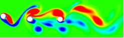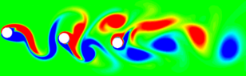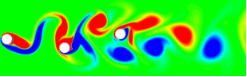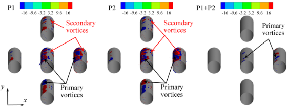 (2)柱体结构群绕流特性研究:对流体与柱体结构群相互作用问题进行了研究,分析了柱体结构群周围流场变化对其水动力特性与尾流模态的影响,揭示了结构群的流场时空演化过程、流体力频谱特性与流场模态之间的关系,阐明了流体与柱体结构群之间耦合作用的力学机理及流动控制机理。(Ocean Engineering,2020, 218: 108245;Ocean Engineering, 2021, 222: 108593.)可为海洋立柱结构群的设计提供参考与理论支撑。