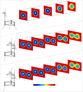 (4)漂浮式风力机稳定性及风能利用优化研究:对海洋环境作用下漂浮式风力机系统的耦合效应与风能利用效率进行了研究,分析了整个系统非线性动力响应及其安全性能,评估其安全性能并优化结构提高安全。另一方面,对漂浮式水平轴风力机群互扰效应进行研究,揭示其尾流相互作用的内在机理,评估其风能利用性能并优化布局提升能效。(Energy Conversion and Management, 2023, 283: 116957)可为漂浮式风力机的设计优化提供参考与理论支撑。