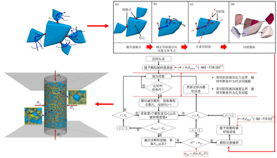 基于颗粒切割方式构建了一种新的基于离散单元法的颗粒破碎模拟方法。该方法利用反函数法对颗粒破碎强度进行赋值,实现了数值模型中颗粒破碎强度的离散化。此外,该颗粒破碎模拟方法有效地避免了传统离散单元法颗粒破碎模拟过程中外部应力引入、质量及体积不守恒等问题,可为进一步优化考虑颗粒破碎行为的离散元数值试验程序提供相应的理论和技术基础。