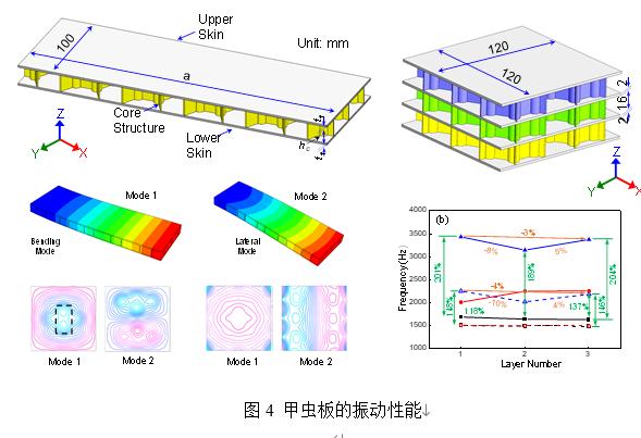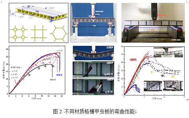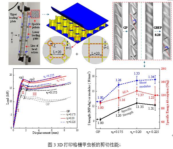 前述研究表明格栅甲虫板是一种拥有优秀压弯性能的夹层板,鉴于实际工程中,结构处于多种载荷共同作用的复杂工况,因此,展开其剪切性能的研究,完善其静力学性能研究的系统性。研究发现与格栅板相比,GBEP单位质量的剪切强度和耗能能力分别比GP提高35%和37%,剪切模量提高了33%。GBEP蜂窝壁的屈曲变形出现更晚,且幅度更小。通过蜂窝壁的屈曲和破坏分析,从小柱和蜂窝壁协同作用等角度,探明了夹层板芯层变形和破坏机制。拓宽了甲虫前翅仿生应用的知识体系,为设计轻质夹层结构提供了有用的指导,为尽早推广甲虫板的应用奠定基础。