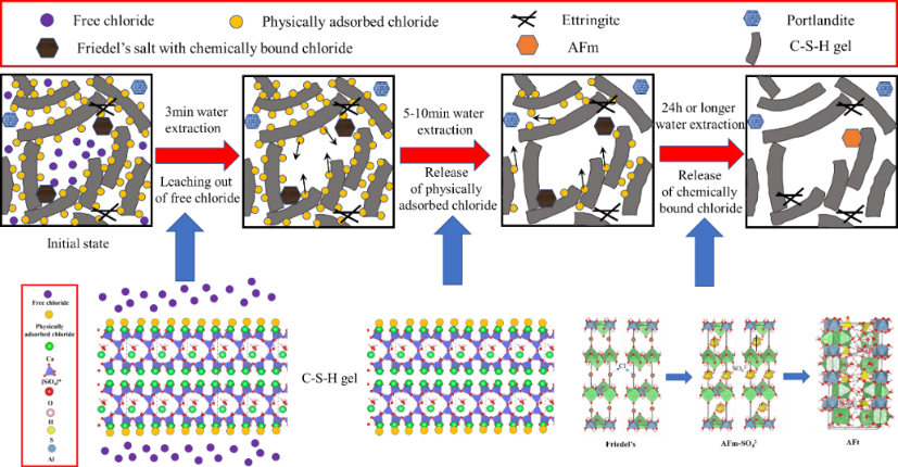 由于超高性能混凝土(UHPC)具有超高强度与超低水胶比,压滤法很难获得UHPC中的孔溶液并测得自由氯离子浓度。水萃取法在测试UHPC孔溶液中自由氯离子浓度研究与应用中表现出较好的前景。立足水萃取法,深入探讨了样品颗粒尺寸、测试温度、水固比、萃取时间、氯盐类型等参数对UHPC中自由氯离子含量测试结果的影响。通过对氯离子分布及水萃取过程中微观结构变化的综合分析得到了UHPC在水萃取过程中微观结构变化与氯离子解吸附过程模型(如图1)。以压滤法结果作为参考,确定了水萃取法最优参数,确定了适用于UHPC中自由氯离子浓度检测的水萃取法。基于提出的UHPC自由氯离子水萃取法,研究了水胶比、辅助胶凝材料(SCMs)以及氯盐伴随阳离子对UHPC微观结构以及氯离子结合的影响机理(如图2)。