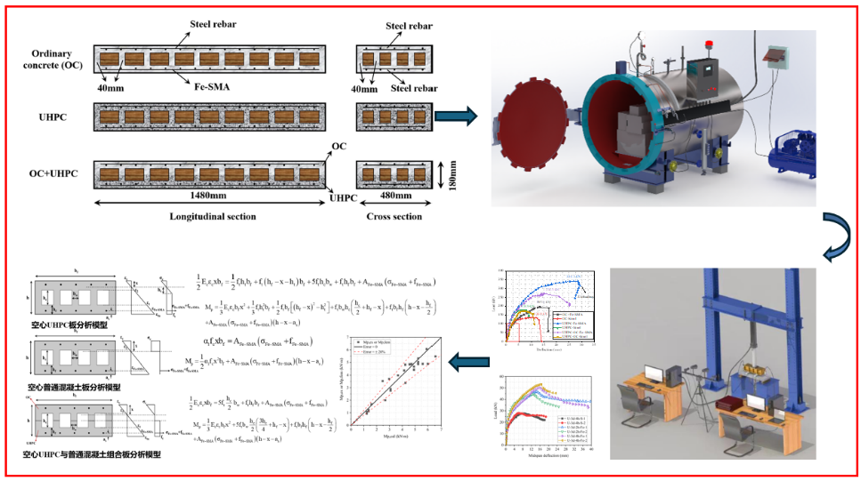 在海洋复杂环境条件下,裂缝的产生会显著削弱UHPC耐久性,尤其是在富含氯离子的海洋环境中,裂缝往往成为腐蚀介质快速侵入的通道。Fe-SMA因其独特的形状记忆效应,能够在加热激励后于约束条件下产生恢复力,产生自预应力效应,从而在UHPC基体内部实现裂缝主动闭合与抑制新裂缝发展的作用。研究结果显示Fe-SMA自预应力不仅显著提升了抗裂性能(约40%)、极限承载力(可达65%-80%)和变形能力(提升20%-110%),还有效减缓裂缝扩展并改变破坏模式。三维数字图像(DIC)等测试结果揭示了Fe-SMA与UHPC在延展性和韧性方面表现出的高度协同性,构建了优异的“高强—高韧”复合体系。同时,提出了预应力计算方法与抗弯承载力预测方法,计算与实测结果高度一致(如图4)。