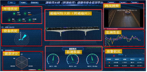 基于通榆河特大桥智慧监测方案,研发了通榆河特大桥健康与安全监测平台。该监测平台由监测数据、路况视频、环境状况、设备状况、报警状况和健康评分等6部分组成。该平台具有无需人员值守,可自动化记录的优点。当低于预设目标分数时,平台自动分析并给出相应的处理建议。此外,基于该智慧运维平台,建立车辆荷载谱及异常数据分析机制和预应力箱梁桥响应数据库,为预应力箱梁桥的智能养护技术提供数据支撑。该监测项目获得2022年中国公路学会桥梁工程创新二等奖。