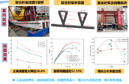 针对多梁桥横向联系降低的问题,提出采用复合桁架代替横隔板的技术,有效提高了各主梁之间的协同受力和桥梁的服役寿命。该技术因具有加固效果好,不中断交通,耐久性佳和环境友好等特点而被广泛应用。试验结果表明,加固后桥梁的最大挠度降低38.6%,极限荷载提高52.3%。目前,该加固技术已在江苏省全面推广应用,据江苏交通控股集团评估,该技术所带来的直接和间接经济效益超过2000万元。此外,该技术获得2022年中国公路学会科学技术二等奖。
