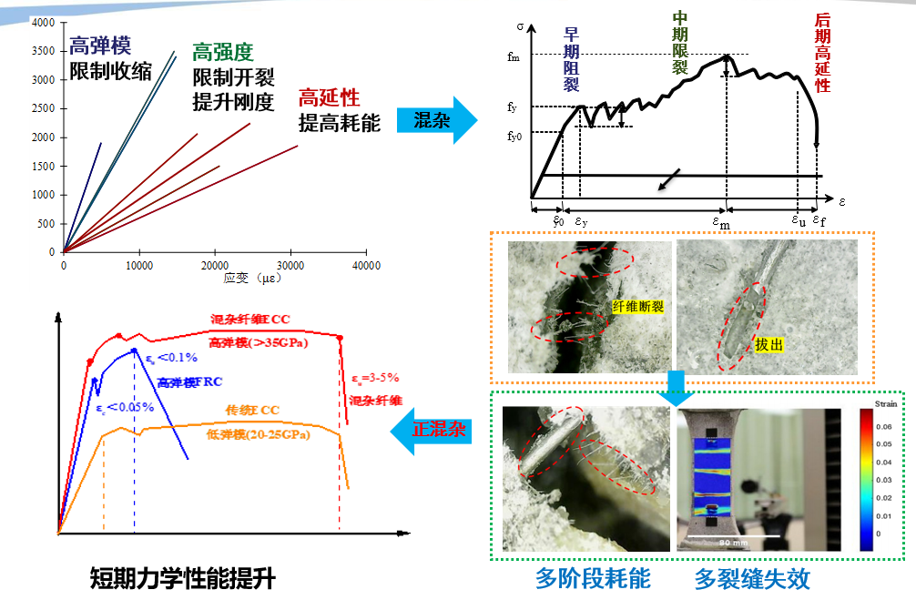 通过纤维-基体界面的精细化优化设计,构建起适配材料内部不同尺度裂纹发展的 “跨尺度裂纹桥接体系”。从微裂纹的早期抑制,到裂纹的中期阻滞,再到宏观裂缝的扩展延缓,纤维与基体界面形成的协同作用可有效分散裂纹尖端的应力集中,避免应力集中导致的突发性断裂。实现“多级耗能、渐进破坏”的延性模式,从而提升水泥基材料的韧性。